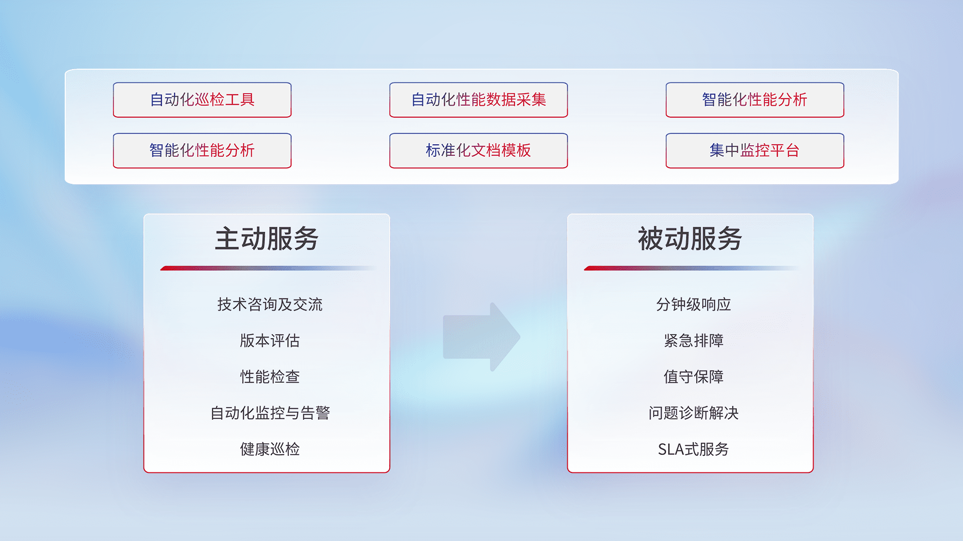 智能化工具和标准化文档,,,,保障服务质量,,,,提供主动服务(包含技术咨询、、版本评估、、、性能检查、、自动化监控与告警、、、健康巡检)和被动服务包含(分钟级响应、、、紧急排障、、、、值守保障、、、、问题诊断解决、、、、SLA服务)。。。。